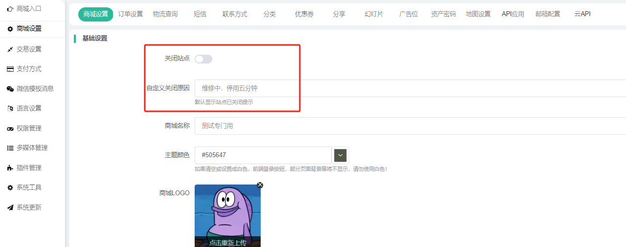 1、设置里选择了关闭站点,前端进入商城会显示“站点已关闭”提示;