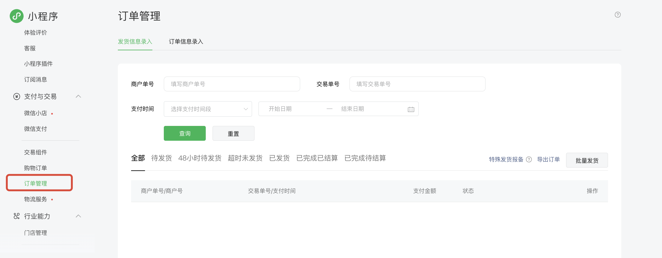 现在小程序平台的发货信息录入改名为订单管理,如下图