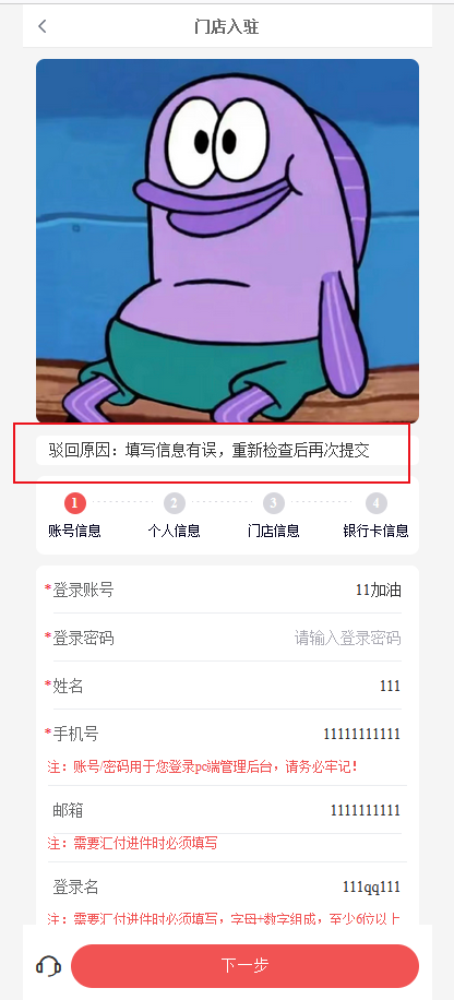 用户在前端可以查看到驳回理由重新进行填写,会保留上一次填写内容直接进行修改即可~