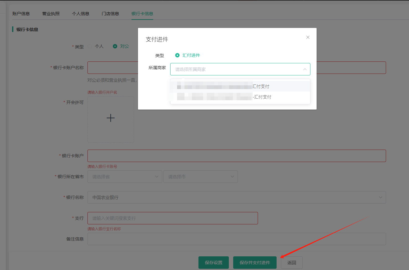 相关信息填写后点击保存并支付进件,会弹出窗口,选择已绑定的聚合分账支付插件里已添加的汇付账号
