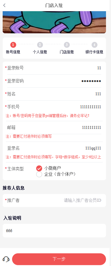 登录账户/密码:需要设置唯一性,不能使用商城使用过的用户名,用于后续登录门店独立后台