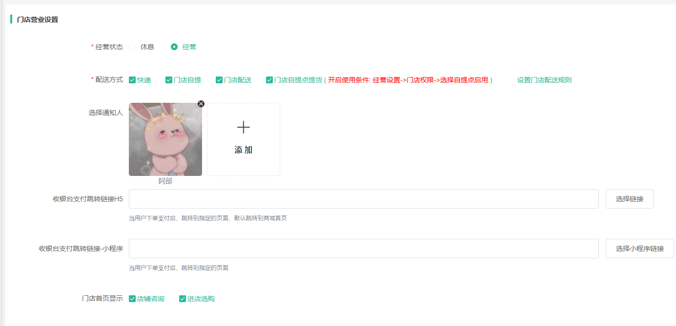 经营状态,配送方式,消息通知人和收银台支付跳转链接设置