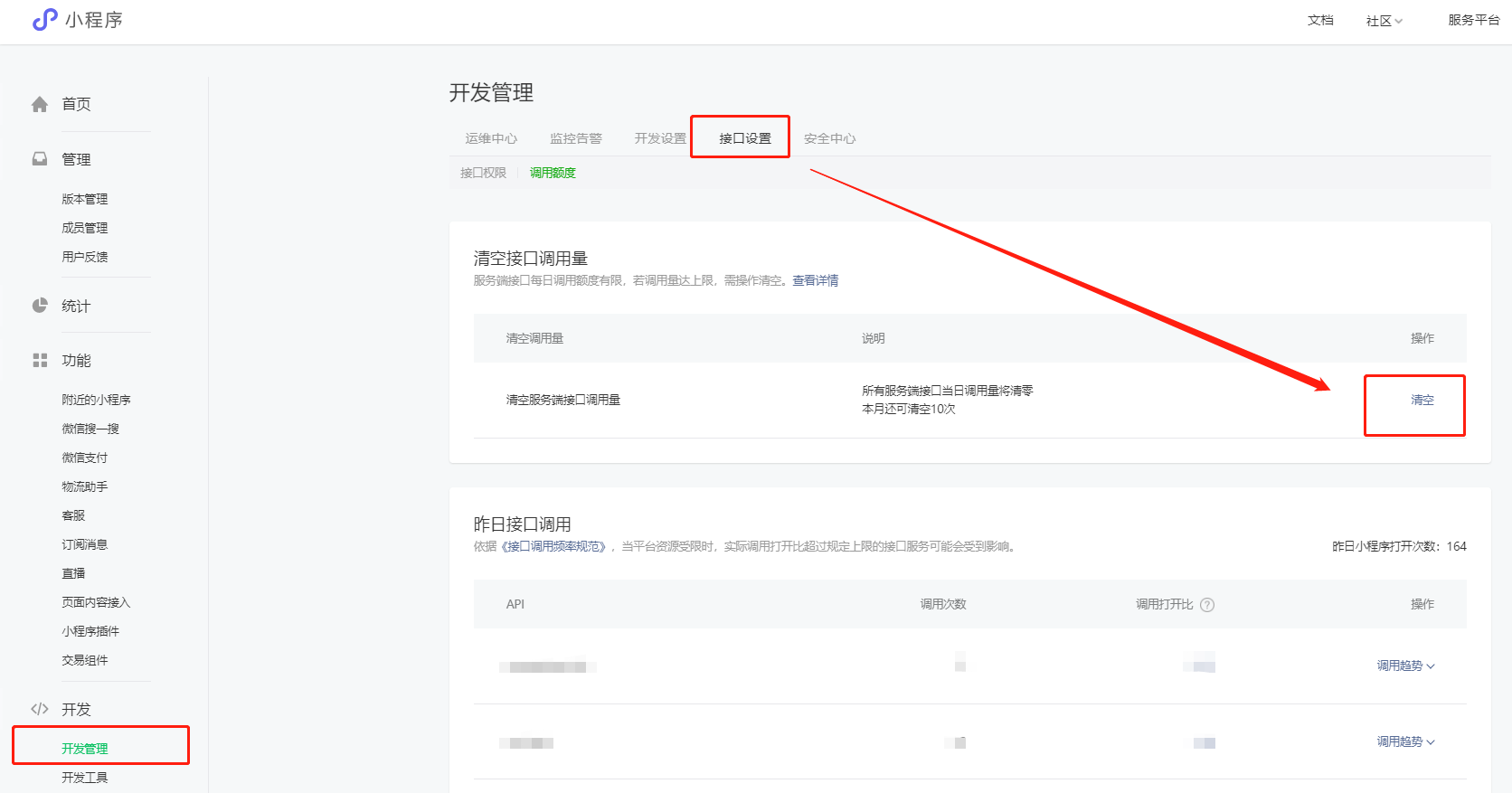 小程序 —— 登录公众平台mp.weixin.qq.com >> 开发 >> 开发管理 >> 接口设置 >> 清空服务端接口调用量。
