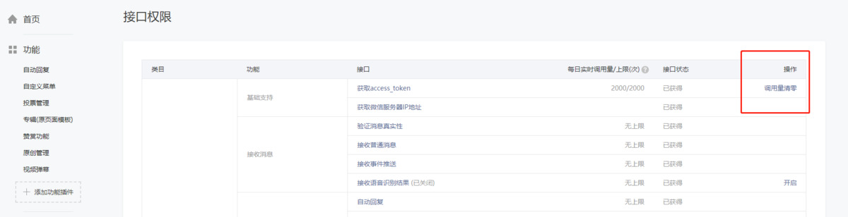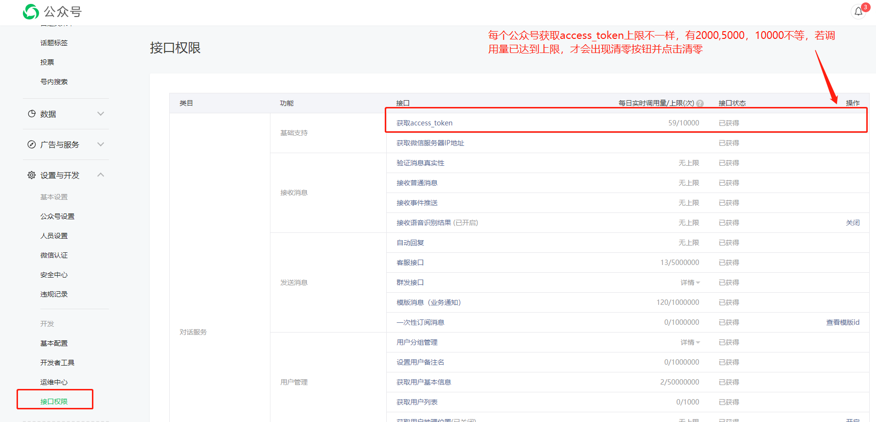 公众号 —— 登录公众平台mp.weixin.qq.com >> 设置与开发 >> 接口权限 >> 清零access_token调用量