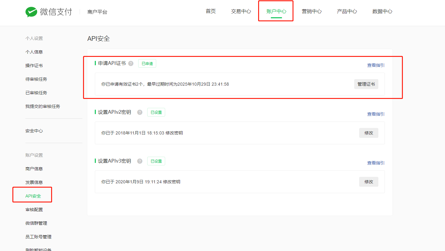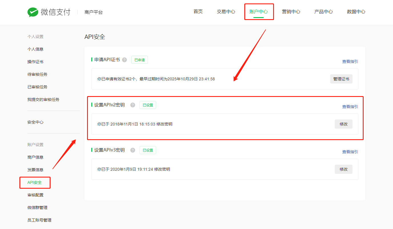 1、未设置aplv2密钥或重置aplv2密钥:登录微信商户号pay.weixin.qq.com -- 账户中心 -- api安全 -- 设置aplv2密钥,后台填写正确的密钥,注意填写时不能前后有空格.