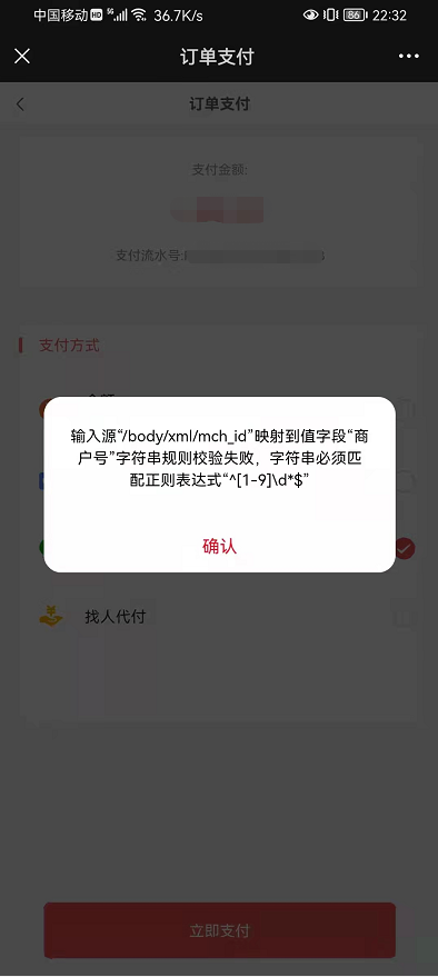 六、支付提示输入源"/body/xml/mch_id"映射到值字段"商户号"字符串规则校验失败,字符串必须匹配正则表达式"^[1-9]\d*$"