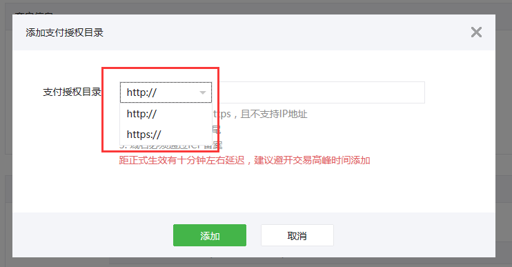 1)支付授权目录的前缀(http/https)——请点击“▼”下拉选择“https://”,不要选http:/