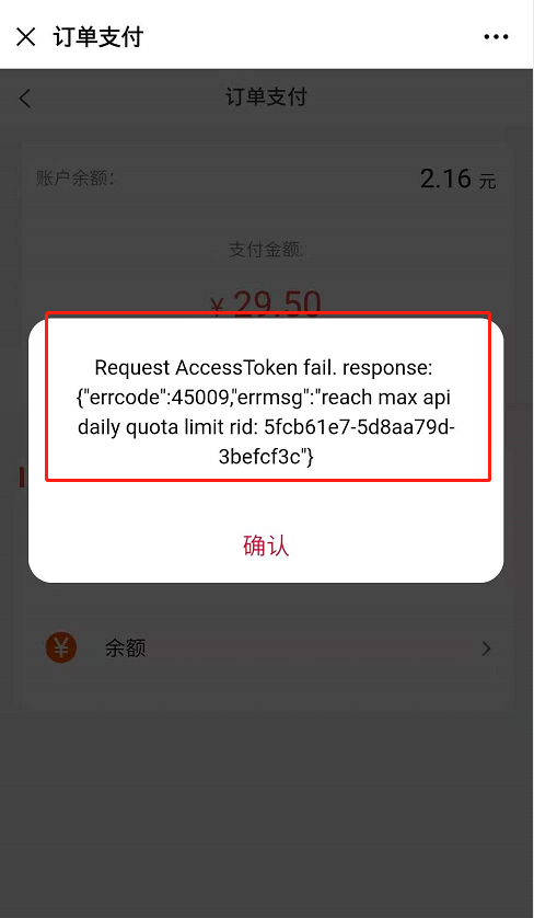 八、微信支付报错:45009,Request AccessToken fail. response: {“errcode”:45009,”errmsg”:”reach max api daily quota limit rid: 5fcb61e7-5d8aa79d3befcf3c”}