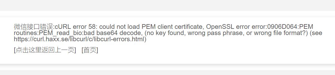 十一、打款到微信提示微信接口错误:cURL error 58:could not load PEM client certificate,OpenSSL error error:0906D064:PEM routines:PEM_read_bio:bad base64 decode,(no key found,wrong pass phrase,or wrong file format?)(see https://curl.haxx.se/libcurl/c/libcurl-errors.html)