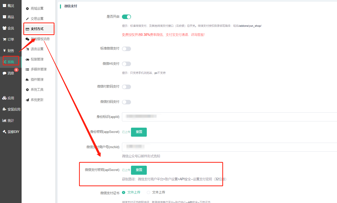 2、若支付密钥apisecret设置的是32位数,说明商城后台填写有误,或前后有空格