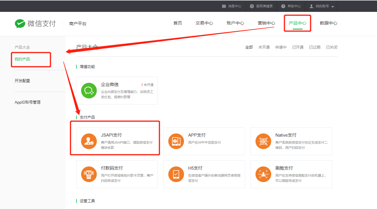 登录商户号后台pay.weixin.qq.com--产品中心--我的产品,开通JSAPI支付权限。如果有PC网站,要用到微信扫一扫支付,开通Native支付,如下图