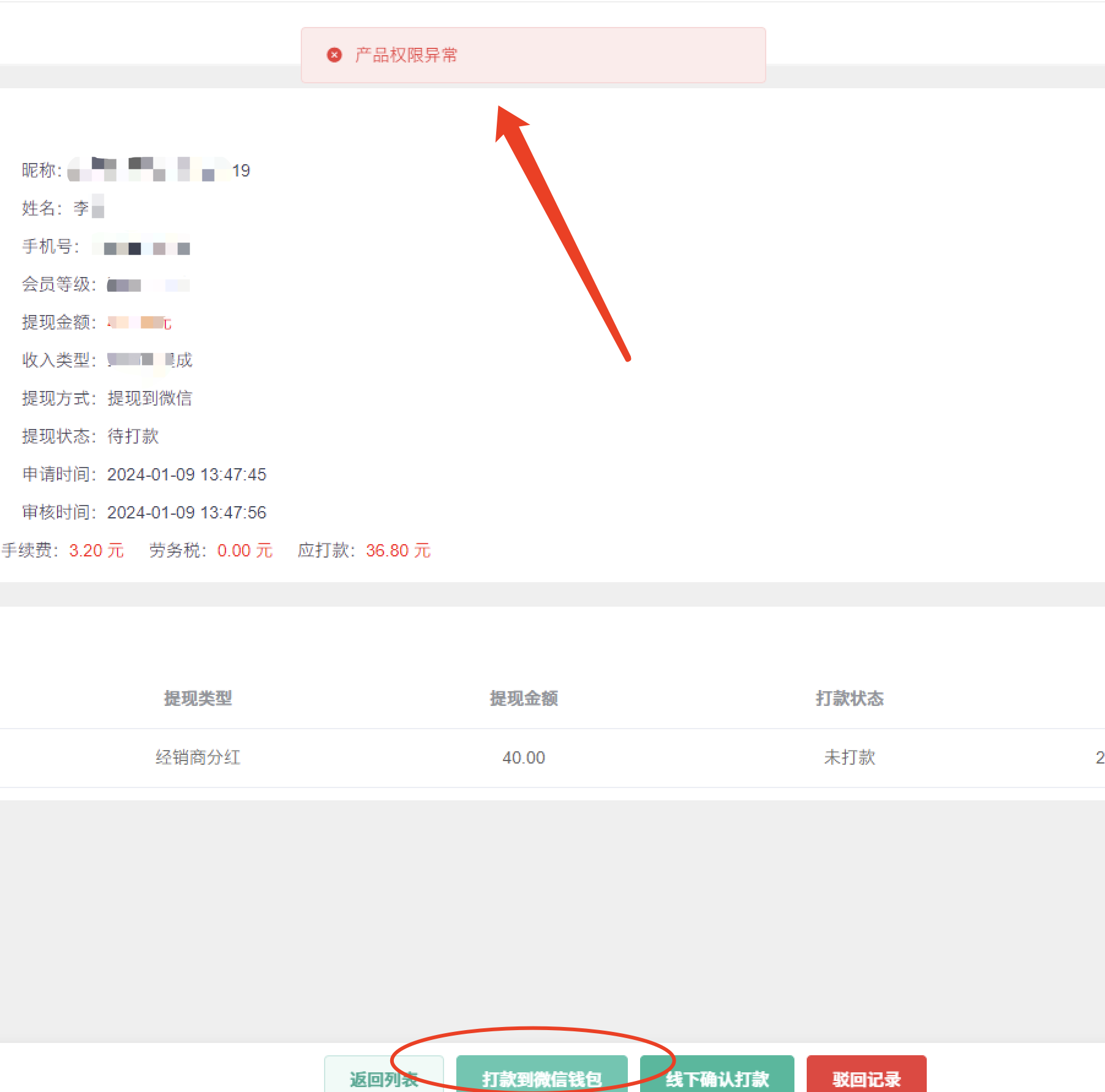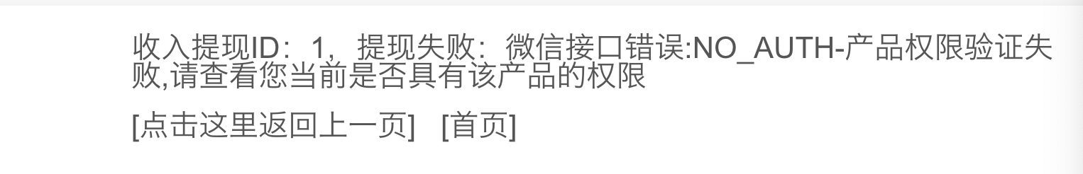 十三、用户提现到微信,后台打款提示提现失败,NO_AUTH-产品权限验证失败,请查看您当前是否具有该产品的权限;或者提示产品权限异常