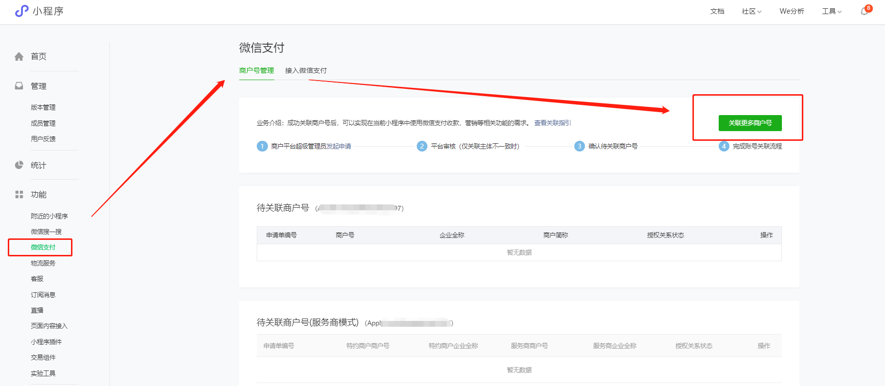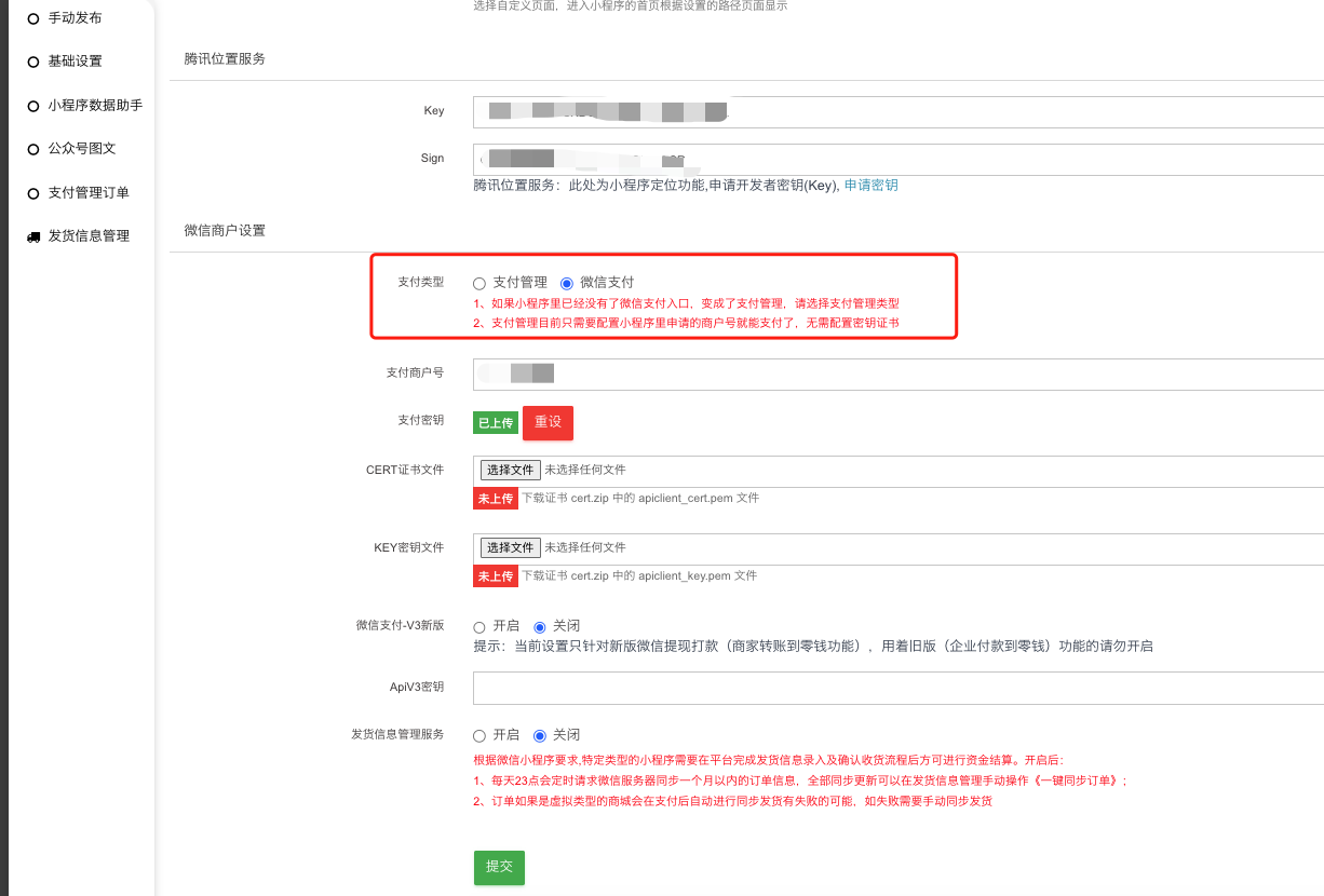 登录小程序平台mp.weixin.qq.com,检查左侧菜单“功能”显示的微信支付是“微信支付”,还是“支付管理”。若显示微信支付,商城后台小程序支付类型对应选择微信支付的。选择后配置好小程序关联的商户号,支付密钥和上传商户证书。