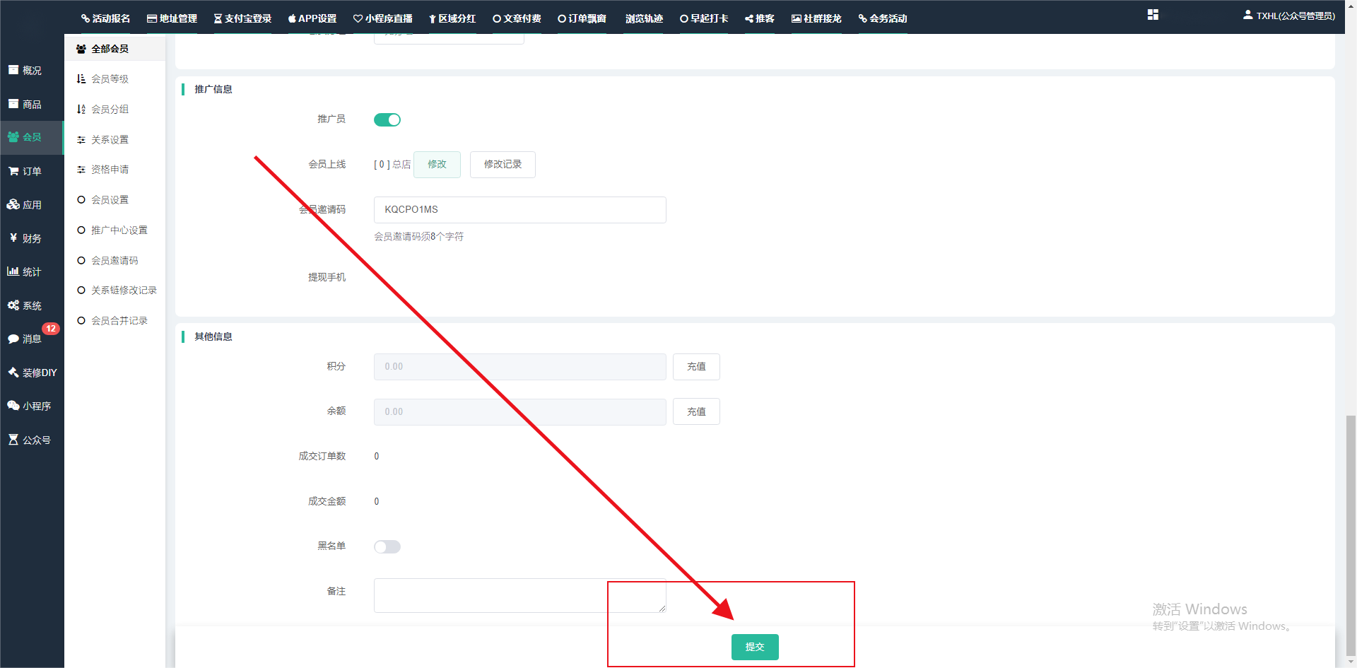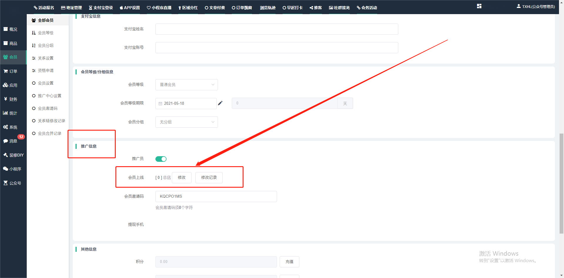 目录 搜索 展开 一、前期准备资料二、数字乡村码-上线操作指南1、服务号的申请流程及认证2、申请小程序流程3、开放平台绑定小程序和公众号三、数字乡村码-系统操作数字乡村码系统管理-概况数字乡村码-商品管理1、发布商品2、商品列表3、商品表单4、商品分类5、品牌管理6、配送模板7、评论管理8、优惠券管理9、商品标签10、退货地址设置11、满额优惠12、批量操作13、配送方式14、基础设置15、商品隐藏四、数字乡村码-会员管理1、全部会员2、会员等级3、会员分组4、资格申请5、会员设置6、推广中心设置7、会员邀请码8、会员关系链修改关系链修改记录9、会员合并记录10、账号注销管理11、会员设置中心五、数字乡村码-订单管理1、订单管理列表2、订单处理流程3、订单状态4、订单修改价格5、订单退款退货6、多包裹发货7、批量发货订单操作步骤8、催发货订单9、物流查询六、数字乡村码-财务管理1、余额设置2、会员余额3、充值记录4、转让记录5、余额明细6、收入明细7、提现设置8、提现统计9、积分管理10、转账审核11、收益广告12、批量充值七、数字乡村码-系统管理1、商城入口2、商城设置①、商城设置②、订单设置③、物流查询④、短信⑤、联系方式⑥、分类⑦、优惠券⑧、分享⑨、幻灯片⑩、广告位⑫、地图设置3、交易设置4、微信模板消息自定义消息模板(新版)自定义消息模板(旧版)小程序消息模板公众号模板消息变更公告5、语言设置6、权限管理7、多媒体管理八、数字乡村码-消息管理九、数字乡村码-应用管理十、数字乡村码系统-数据统计十一、数字乡村码-页面装修DIY1、模板管理2、店铺页面3、顶部导航4、底部导航5、DIY模板市场6、首屏广告7、基础设置8、装修DIY尺寸建议十二、供应商功能插件操作指南1、供应商2、门店-收银台门店申请和使用步骤门店管理①、门店-收银台 营销设置②、门店-收银台 分润设置门店分类门店申请门店审核门店商品门店商品订单收银台订单数据统计核销员基础设置默认设置门店装修3、微社区4、会务活动十三、营销插件操作指南活动报名提货卡新人奖微店问卷调查积分视频分享1、视频分享基础设置2、视频分享发现管理3、视频分享分类管理4、视频分享评论管理5、视频分享分红记录6、视频分享短视频中心每日红包幸运大抽奖签到优惠券二维码任务奖励优惠劵文章音频文章付费文章限时购新海报拓客卡操作流程积分活动素材中心视频红包十四、入驻门店应用类1、门店预约2、附近商品3、门店定位设置4、门店控制5、门店满额包邮6、门店满额减7、导入商品8、门店搜索9、门店股东10、核销券11、多门店核销1、商城后台设置2、前端功能演示十五、常见问题1、后台登录密码修改流程2、会员-余额,积分,后台如何进行充值与扣除3、如何修改上下级关系4、一种万能的获取商城小程序路径的方法 暂无相关搜索结果! 阅读次数:1810 本文档使用 模王系统 发布 3、如何修改上下级关系 如何修改上下级关系一.如何修改上下级关系?1.会员-全部会员-可以通过搜索用户的独立ID,或者用户微信昵称,找到此会员,然后点击右边的(操作)2.再点击会员详情。3.滑到下面,有个推广信息-会员上线,点击修改4.输入上级的ID号,点击搜索,出来此上级会员后点击选择。5.滑到最下面,一定要点击提交按钮。文档更新时间: 2024-01-05 14:50 作者:链上旅行